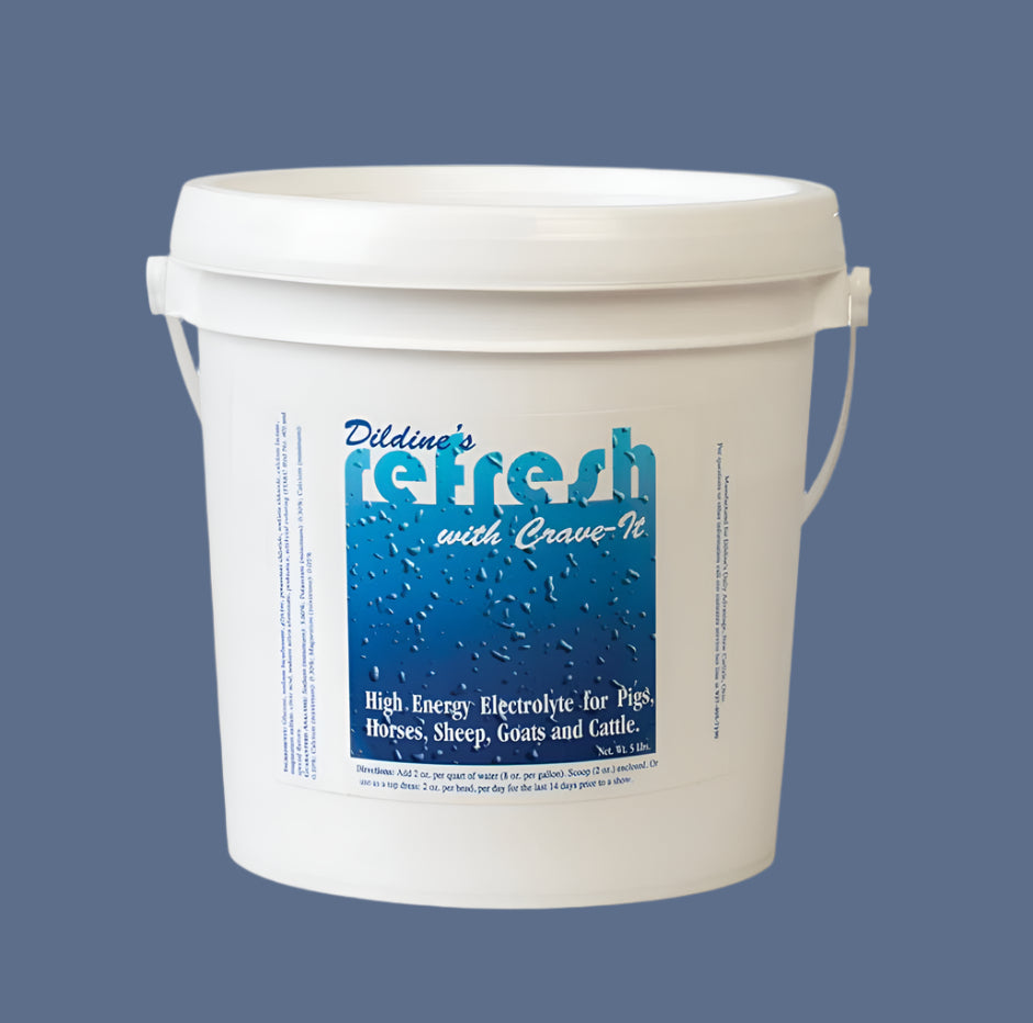 Dildine’s Refresh with Crave-It is a high-energy electrolyte powder that animals crave. It adds optimal fill, muscle and bloom prior to show time. Crave-It entices animals to drink and eat the necessary amounts during long hauls and shows. For swine, sheep and cattle.